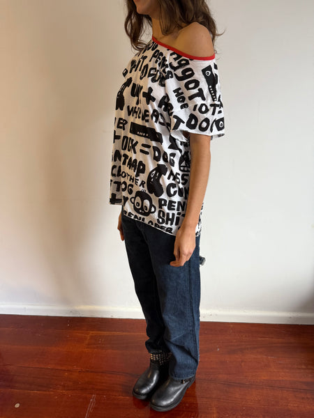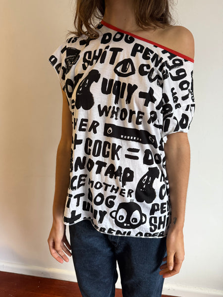 A crazy early 2000s vintage Bas Kosters t-shirt with all over curse word print. Shock your friends!