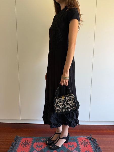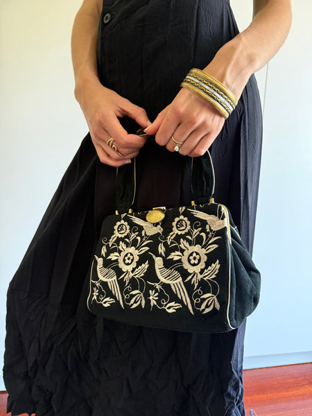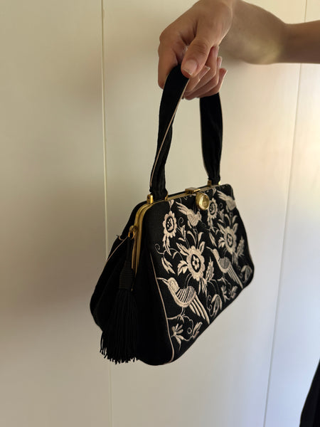 Beautiful vintage 80s embroidered Norma Kamali bag with tassel detailing on side.