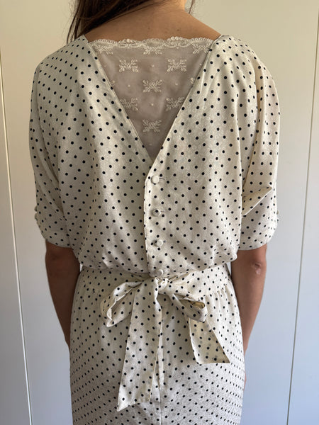 White with black polka dots, subtle floral patternt throughout.