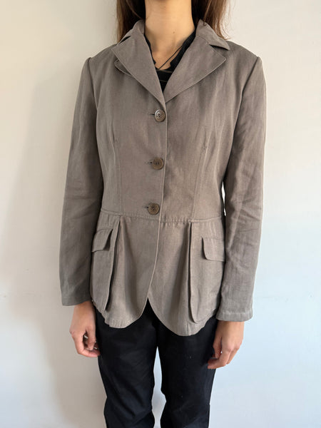 A vintage 90s Giorgio Armani tailored jacket with chin strap detailing, tailored waist and peplum. Featuring large pockets at hip.