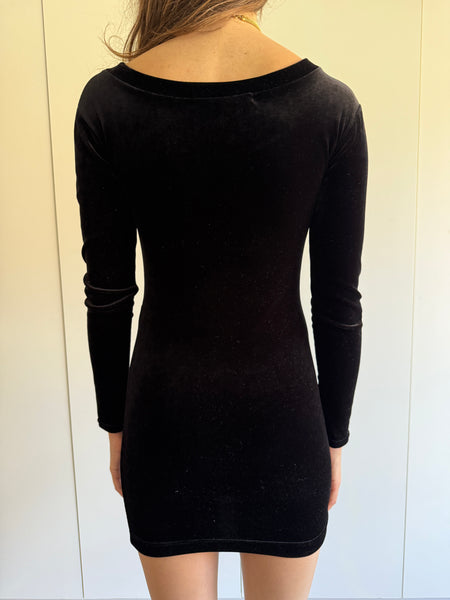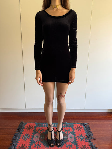 90s vintage Katharine Hamnett velvet bodycon mini dress.