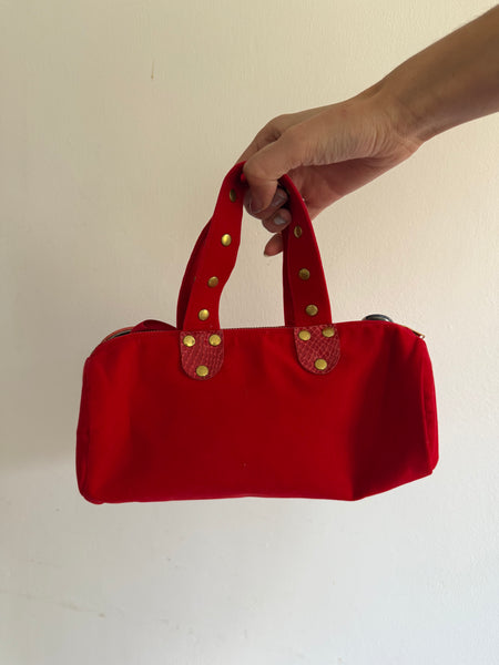 A vintage 00s Guriguri bag with detachable charms including badges, a stop sign, a little car and other bits and bobs. Mini boston bag shade with studded handles.