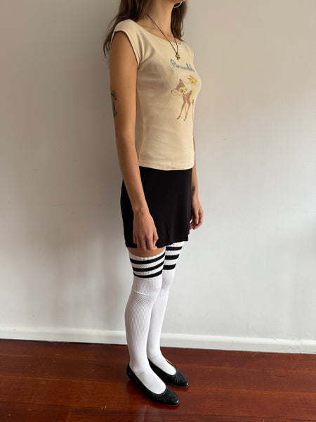 Mini (but not too mini) skirt with a subtle a-line shape. Cut from our signature mid-weight matte jersey, which has a slinky, smooth hand feel and really amazing drape. The back of the mini skirt is slightly longer than the front to accommodate a variety of bum sizes. Intended to be worn mid to low rise. Elasticized waistband. Fully lined for extra coverage. Seam at center back. Self: 100% Rayon. Lining: 87% Nylon, 13% Spandex.