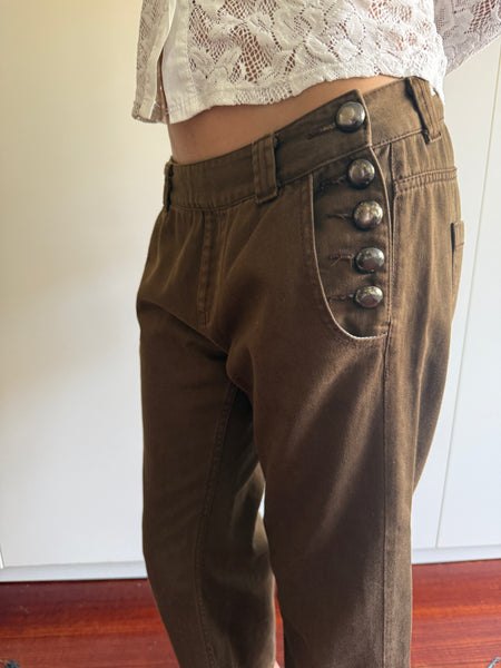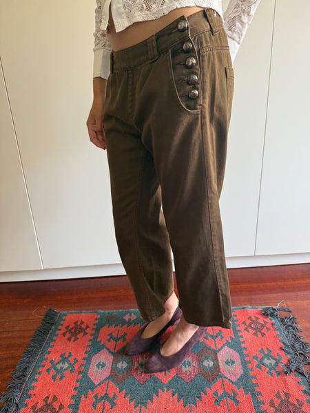 Tricot Comme Des Garcons khaki sailor pants with lots of buttons in a greeny brown colour.